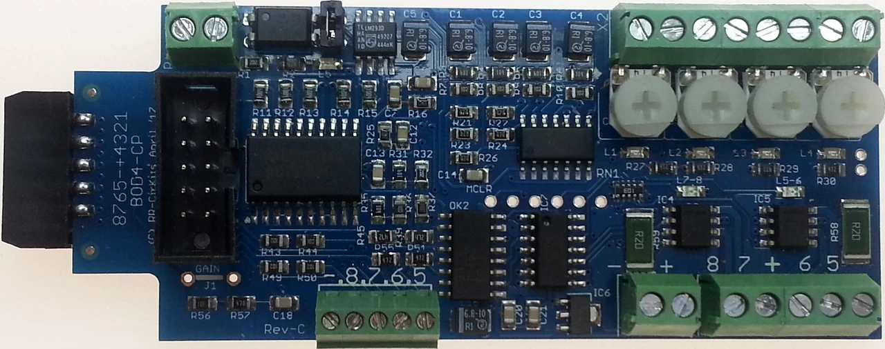 (Block Occupancy Detector-4) This board operates as a DCC occupancy detector for 4 blocks using remote CT coils. It outputs logic levels, and has a RR-CirKits standard ribbon connector interface. The “Power-Lok” feature optionally monitors the DCC bus power. A power failure latches the detection status of each block until power is restored and re-stabilized. The CP version also includes dual turnout drivers. When used with the Tower LCC or Signal LCC boards there are also 4 general purpose I/O connections. These are not available when used with older LocoNet based devices.