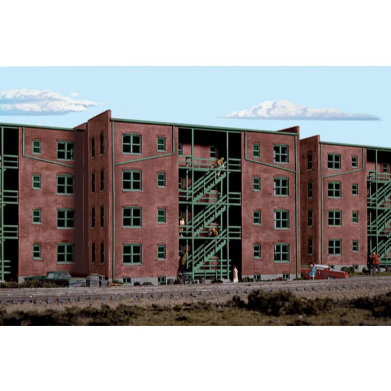 This Walthers Cornerstone Background Building provides a smooth, realistic transition between 3-D foreground scenes and printed or painted backgrounds. Generations have called brick apartments like Parkview Terrace home. Whether bright and new in the steam-era, run-down on the “wrong side of the tracks” in the 1970s or remodeled as upscale condos in the present, Parkview Terrace Apartments are a great way to add detailed big city buildings along your railroad right-of-way. Like the real thing, this model puts the most building in the least space. The kit can be used on the edge of your benchwork, along a shelf or modular layout and in dioramas. When placed against your background scene, or against a module skyboard, it gives the scene a deeper look in only a couple of inches. Designed for easy construction, you can build this kit as a three-story building or shorten it using cut lines molded on the inside. The building also comes with a variety of add-on details, a partial roof and colorful decals. Just add SceneMaster figures and details (sold separately) to create amazing mini-scenes. Perfect for use with other Cornerstone Series kits, this model can also be combined with the entire line of Background Buildings to create a realistic metropolitan backdrop for your favorite modeling era. Designed for use between scenery and painted or printed background Easily add depth between rearmost tracks and your backdrop Easy-to-build plastic kit Great for steam or diesel-era layouts Brick three-story building back Detailed wooden stairways with landings Fits 1920s to present layouts Molded in appropriate colors