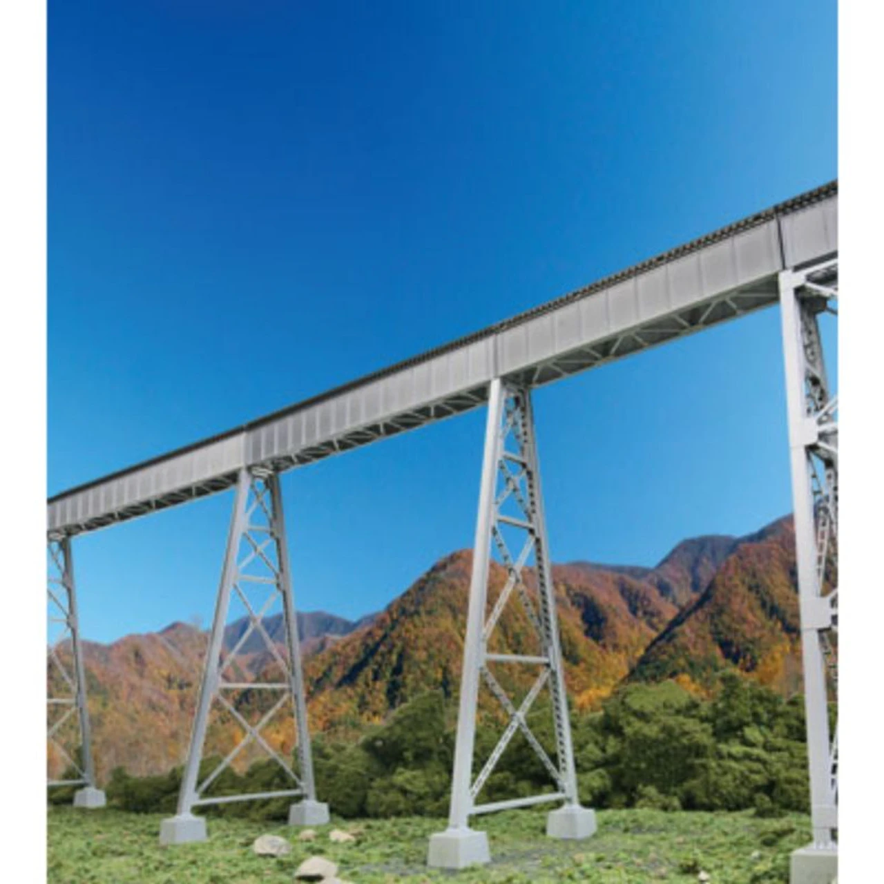 Walthers Cornerstone Steel Railroad Bridge Tower Bents are just the thing for constructing impressive steel viaducts on your layout. This kit includes parts for two tower bents used for supporting deck girder bridges of varying lengths. Add realism to your HO railroad with the Cornerstone Engineered Bridge System! Part of the Cornerstone Engineered Bridge System. Common prototype design used with various types of bridges Fits steam, diesel and modern-eras Highly detailed parts Easily cut to three different heights Two sizes of concrete pedestals included Use with Cornerstone Standard 30′, 50′ and 70′ Deck Girder Bridges (each sold separately) to model a continuous viaduct Each Steel Railroad Bridge Tower Bent measures: Width at Base: 4-1/2″ 11.4cm Width at Top: 1-13/64″ 3cm Height: 10″ 25.4cm Footings Large: 29/32″ 2.5cm Tall Small: 1/2″ 1.5cm Photo shows a typical viaduct modeled with Steel Railroad Bridge Tower Bent 2-Packs (933-4555), and 70′ Standard Level Single-Track Railroad Deck Girder Bridges (933-4507), each sold separately: