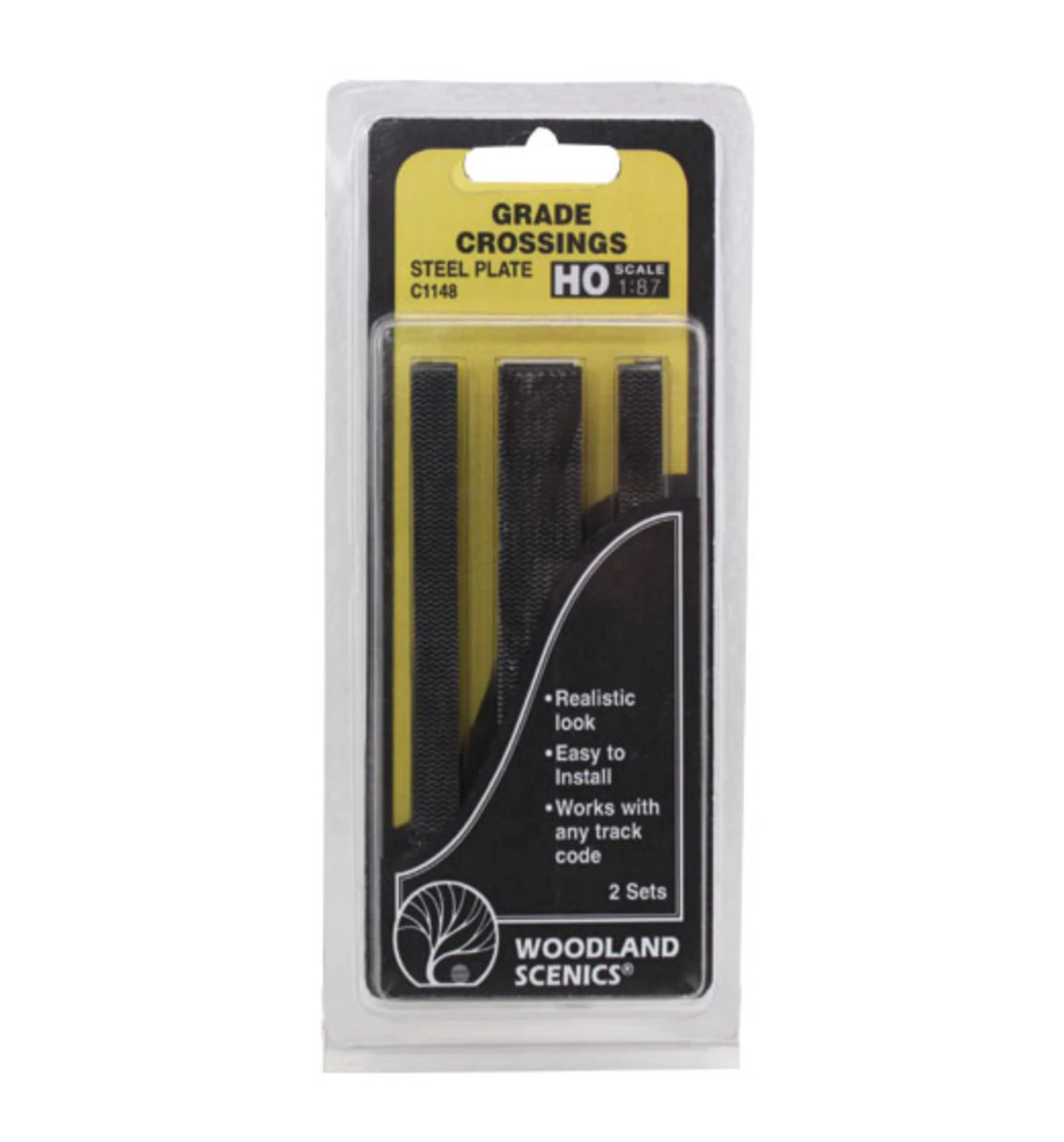 Realistic looking and ready-to-place. Injection molded styrene Steel Plates are notched to fit over rail spikes. Includes pre-cut styrene shims to correspond to proper code. Two crossings in each package.