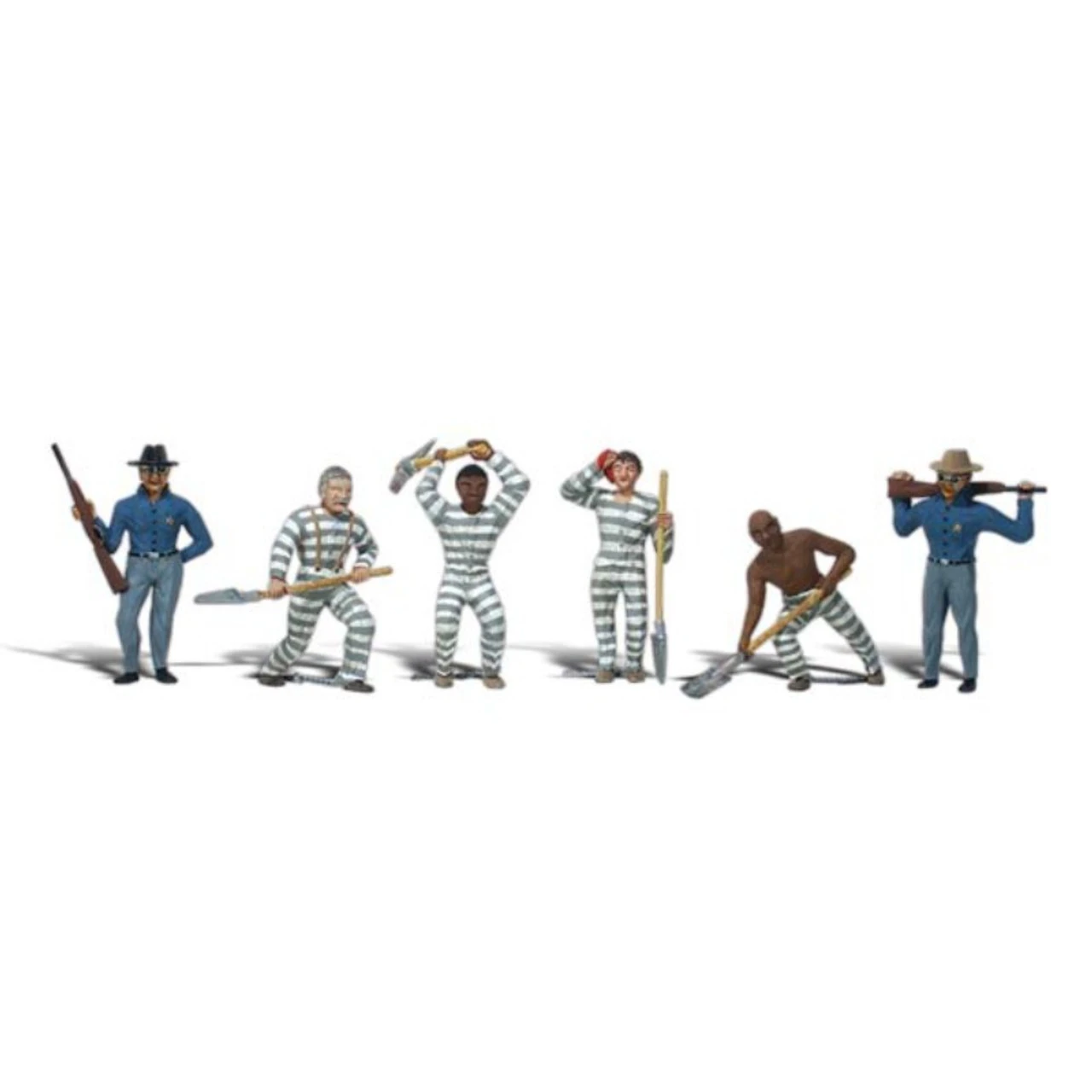 Two guards with guns stand watch over four inmates. One inmate leans on his shovel and wipes his brow while another stands holding his shovel. Another inmate swings a pickax overhead while the fourth inmate shovels. Set contains 6 pieces. Colors may vary from actual product. Complete your scene and bring it to life with affordable works of art in HO scale. Sculpted in fine detail and hand-painted, they add color, humor and interest to any layout. Scenic Accents figures have a natural charm and a realistic appearance that steal the show! Economy packages also available in HO scale. Attach with Scenic Accents Glue and position with Gentle Grips®.