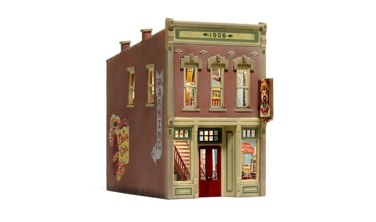 Residents of your layout will want to shop at the classic Toy & Hobby Junction. This mid-20th century era Built-&-Ready® structure features a grand staircase in the center of the two-story building. Showcase the colorful games and hobbies filling the store shelves with LED lights made for use with the Just Plug® Lighting System. View the detailed interior from windows located on every side of the building. This building is hand-painted and authentically weathered. Exterior details include bright red double doors, a train mural and a variety of signage. Toy & Hobby Junction will be available in N, HO and O scales.